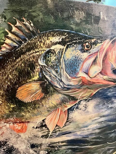 Beautiful bright canvas art print of a largemouth Bass fish. Prints are made using a high end fade resistant ink. Canvas is wrapped around a lightweight wooden frame with a 1/2" unprinted raised edge.