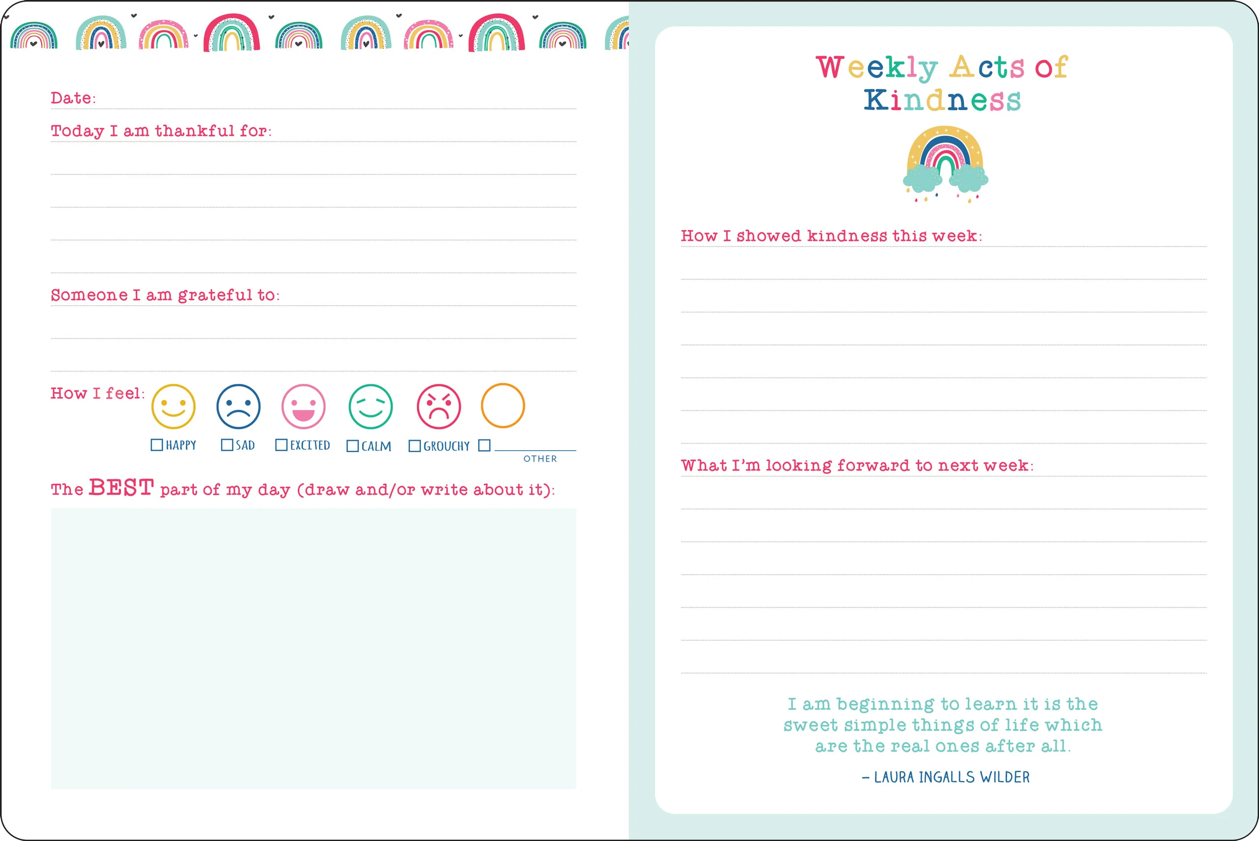 Let this colorful, child-friendly journal guide the way toward cultivating an attitude of gratitude! Making time each day to express gratitude can help your child feel happier and more self-confident. This journal's daily prompts encourage your child to focus on what they are thankful for, how they feel, and what has made them happy. The practice of journaling provides a wonderful way to spend time together and reflect on the positives of each day. At the end of each week, space is provided to write about how your child put gratitude into action by showing kindness to others. The ''Gratitude in Action'' pages at the end of the journal offers suggestions for doing just that. Thick journal pages support pen or pencil. 120 gsm paper is acid-free and of archival quality. Journal lies flat for comfortable writing. Inside back cover pocket expands to hold n