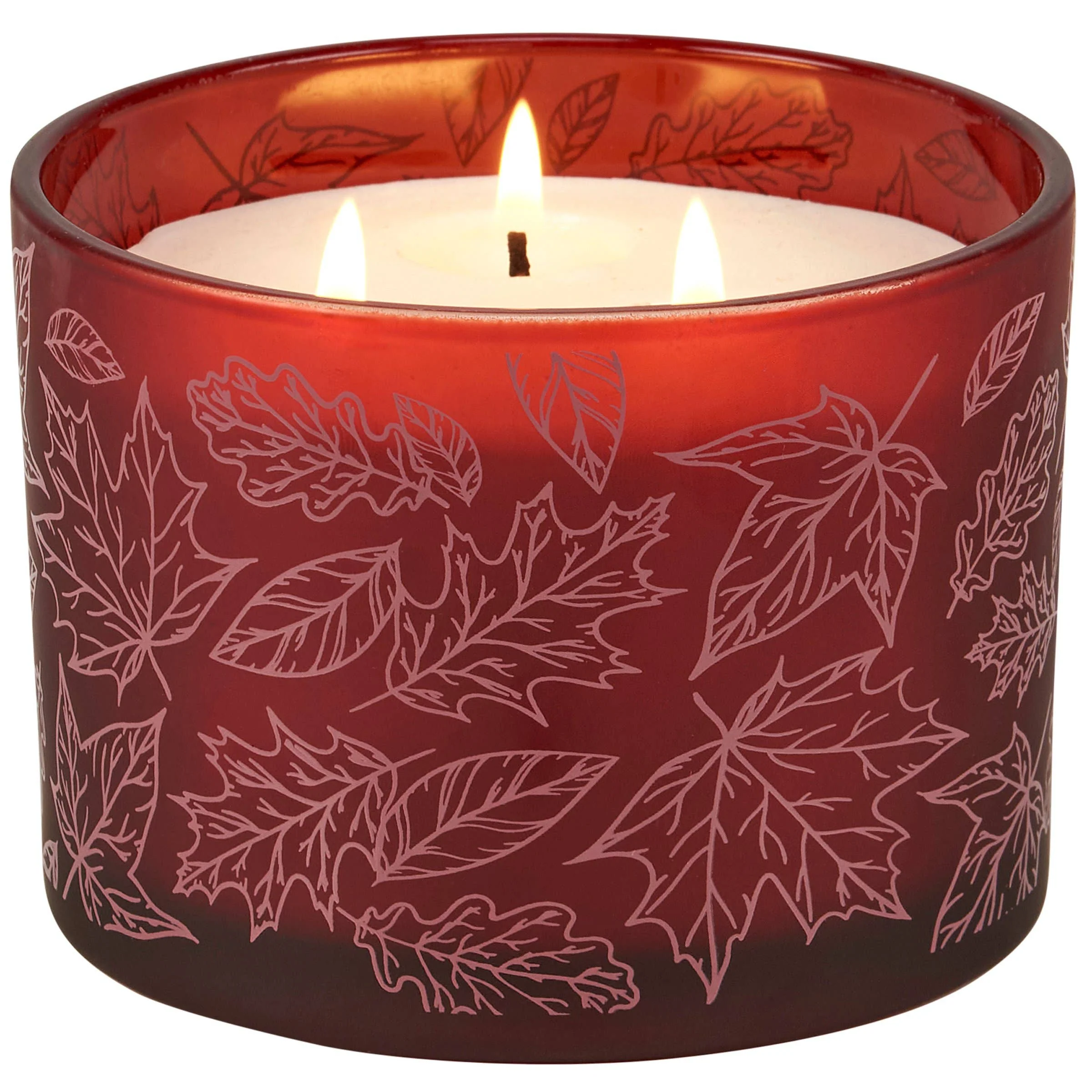A jar candle from our Fall & Harvest Collection displaying a deep autumn red frosted glass background with hand illustrated designs of falling autumn leaves. Seasonal candle features soy-based wax and 3 fabric wicks with 30 hours of burn time activating a calming Autumn Leaves scent. Our Falling Leaves jar candle includes a dust cover and plastic lid for protection and polished appearance. A fall-themed home accent that is great for gifting.