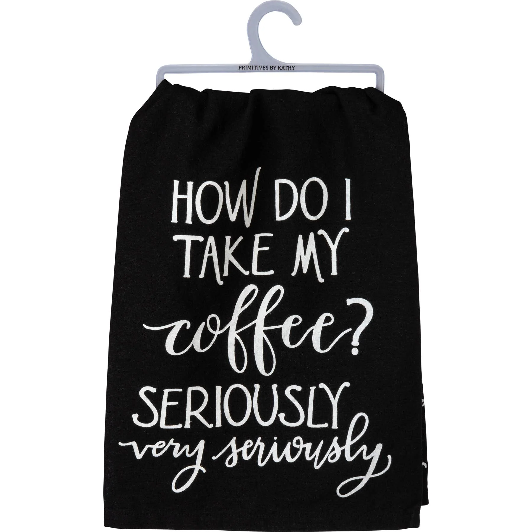 A black cotton kitchen towel featuring a hand lettered "How Do I Take My Coffee? Seriously Very Seriously" sentiment and coffee cup design. All-over print design. Machine-washable.