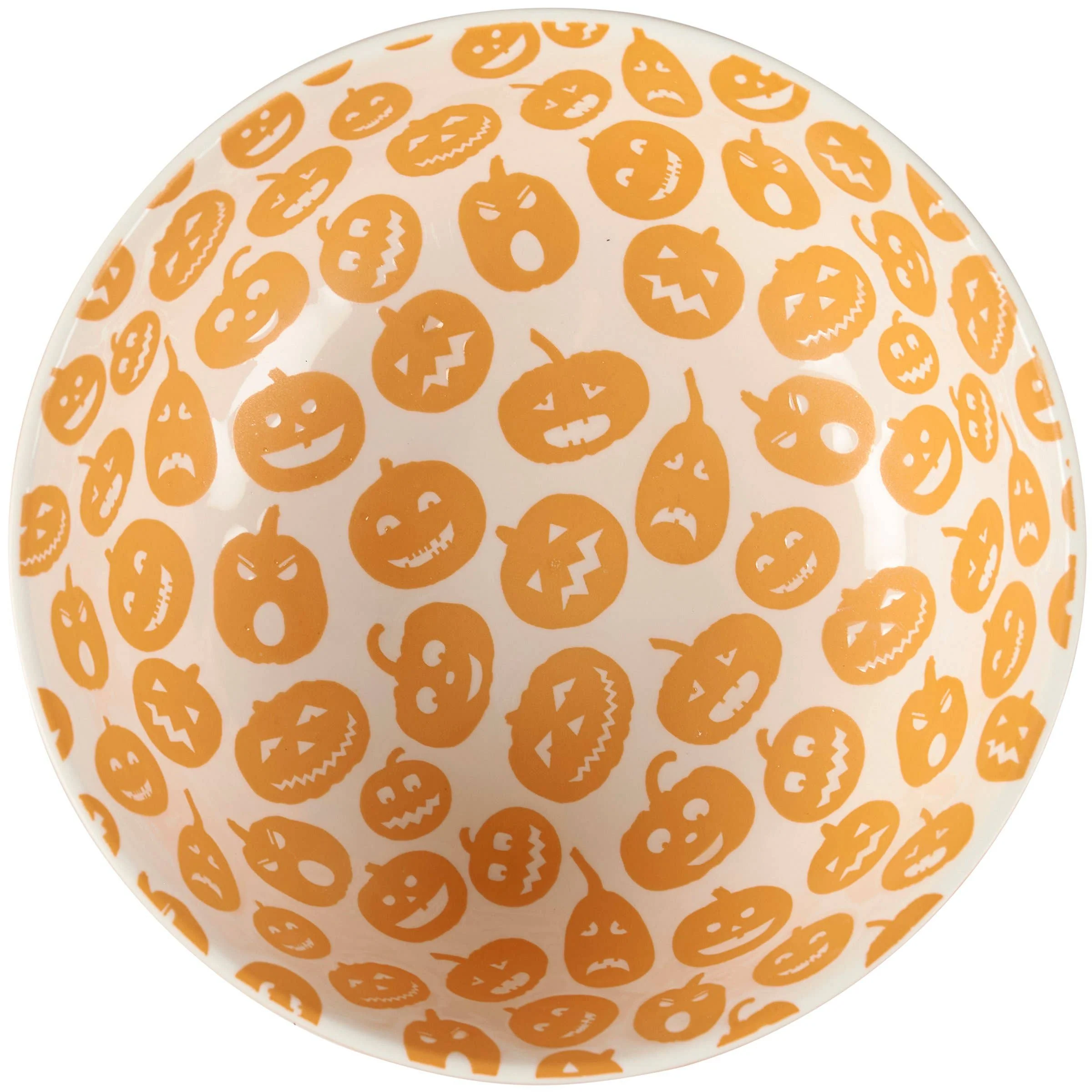 A durable stoneware bowl set from our Halloween Collection featuring three different size bowls that nest inside each other for easy storage. Each bowls displays a solid color on the outside with debossed Halloween-themed patterns inside on glossy white. Large and small bowls feature orange color with jack O'Lantern patterns and medium bowl features black color with spooky bat patterns. Our Jack O'Lantern bowl set is microwave, dishwasher, and food safe for convenient use. A fun set of tableware perfect for seasonal gatherings.