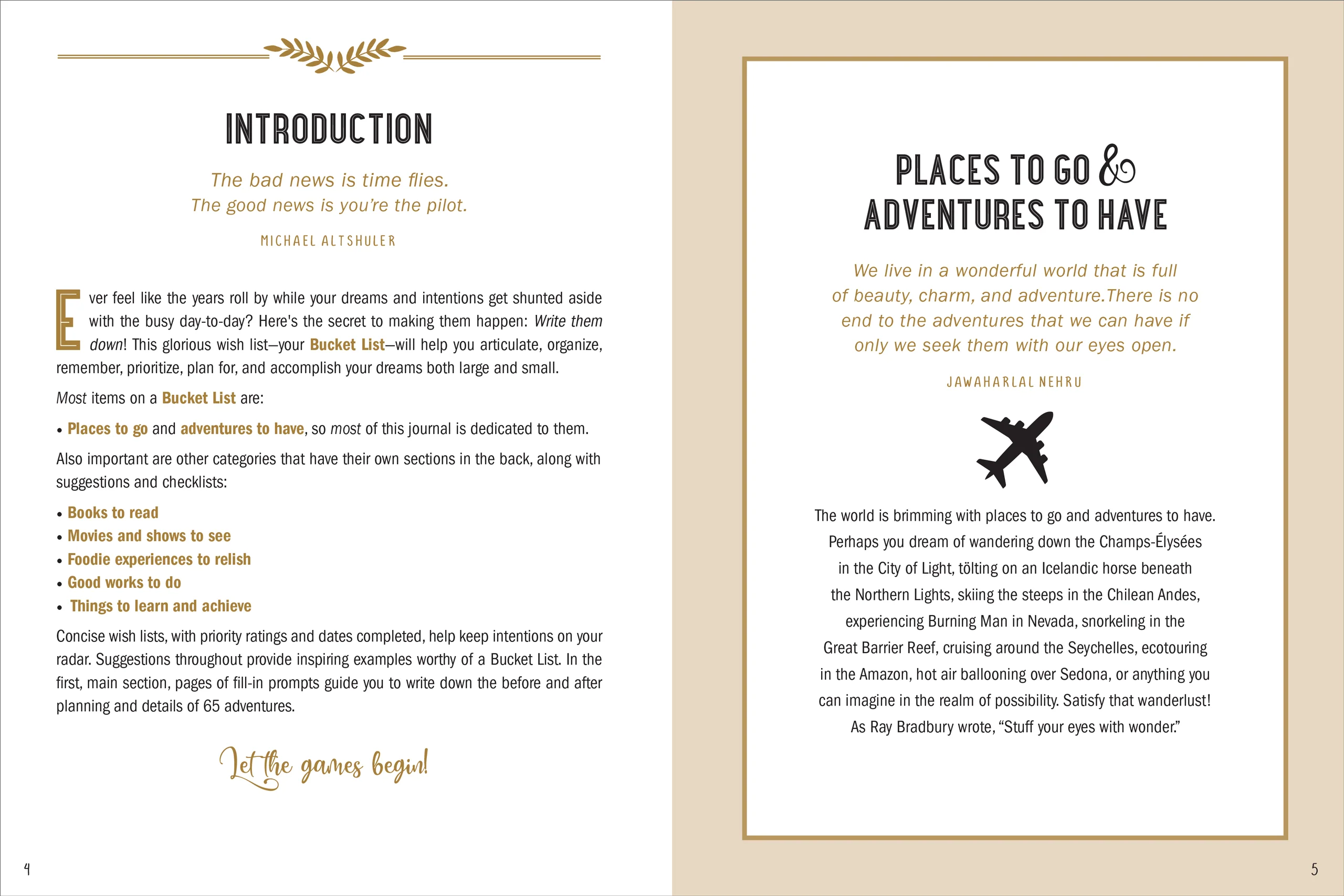 This invaluable prompted journal will help you articulate, prioritize, plan for, and accomplish your ''bucket list'' dreams and intentions, both large and small! Use the main section to write the before and after details of 65 trips and experiences. Smaller sections are dedicated to books to read, movies and shows to see, food and drink, good works to do, and things to learn or achieve. Adventures await! Handsome black hardcover binding is stamped with gold foil. Thick, smooth-finish pages support pen or pencil. Acid-free, archival-quality 120 gsm paper helps preserve your entries. A handy inside back cover pocket holds notes, bucket list mementos, and more. The elastic closure keeps it all together. Durable binding, Journal measures 6-1/4'' wide x 8-1/4'' high. 160 pages.