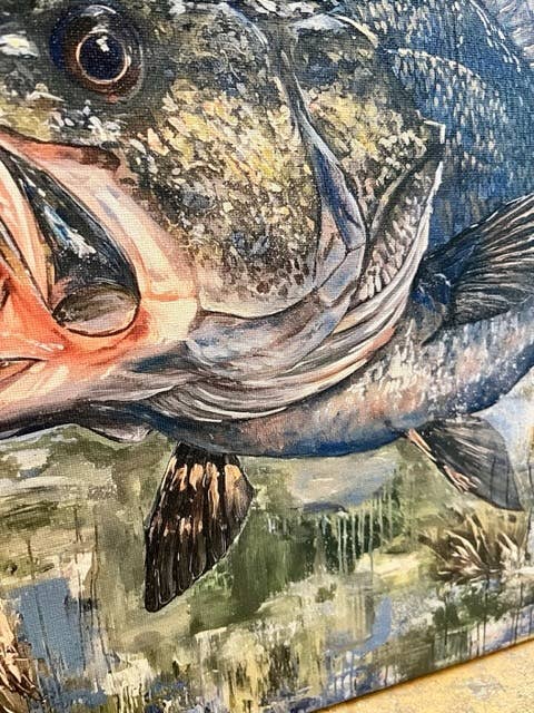 Beautiful bright canvas art print of a largemouth Bass fish. Prints are made using a high end fade resistant ink. Canvas is wrapped around a lightweight wooden frame with a 1/2" unprinted raised edge.